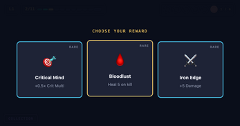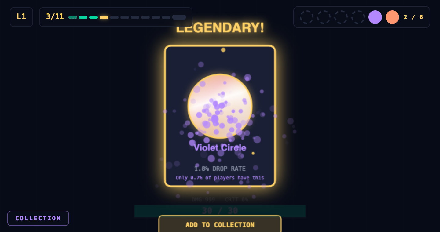 Nice, it's a bit too easy, I'd either lower damage or crit nominally. Also should it still offer crit upgrades when crit is already 100%? The "Add to collection" button is cropped :) maybe one could gain something from completing sets (e.g. if I collected all red ones I get a health related feature etc.)
