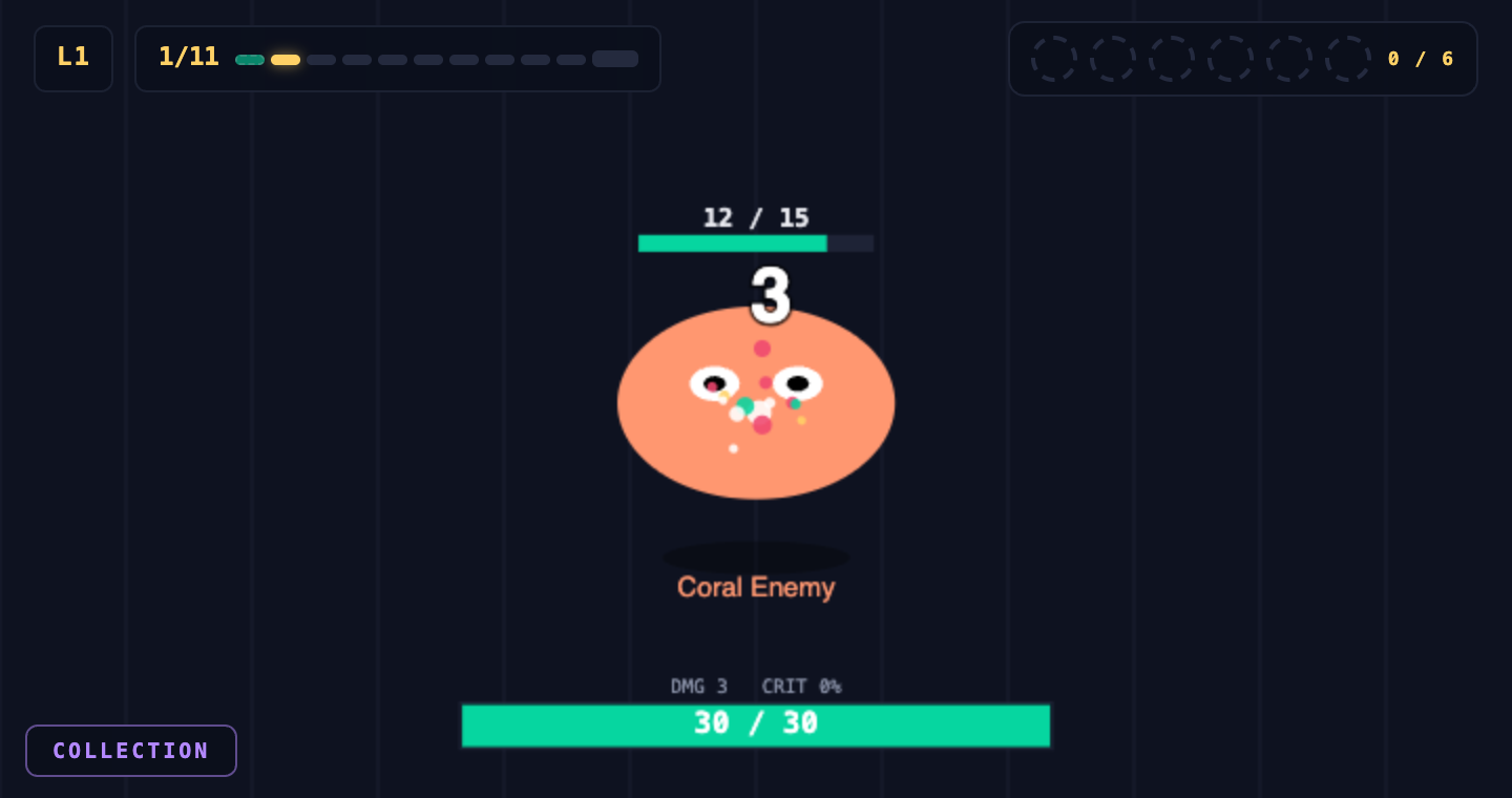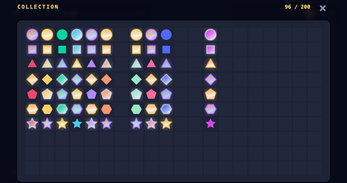 A click-battler where you tap at colorful shapes and slowly fill out a collection grid. Kill enemies, pick a card, move to the next fight, try not to die. If you do, your colors turn into ghosts and you have to earn them back.