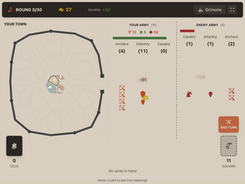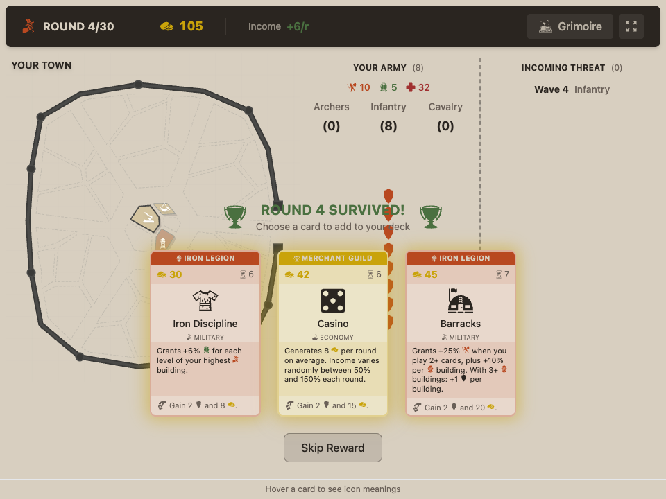 Iron Ledger is a strategic deck-builder where you defend your town against waves of enemies. Cards you don't play become your army. So, every card in your hand is a decision. Play it to build. Discard it to fight.