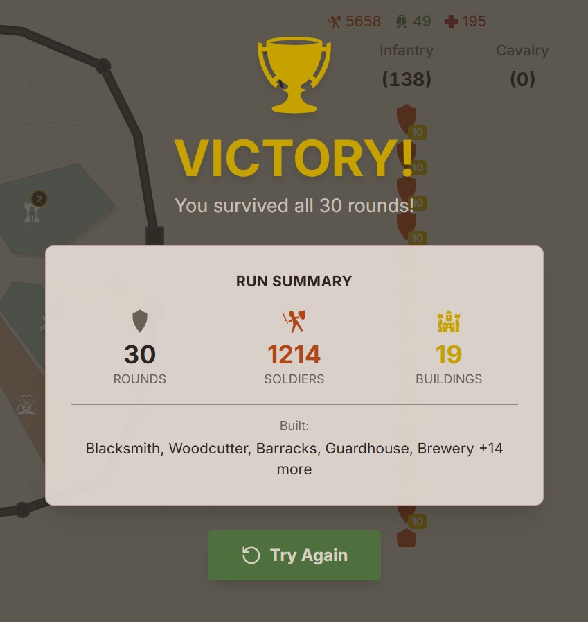 After a while i got something right, a balance between defence and building, and my last run improved so much after round 20 it got so easy i just started building everything available.